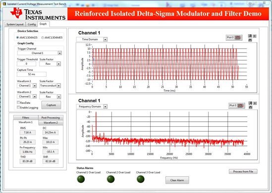 图 2 给出的解决方案在一款新型电流检测参考设计中进行了展示:TIPD165。以该参考设计为指导,系统设计人员将拥有一个对 AMC1304M25 和 TMS320F28377D 进行实验的完整平台。TIPD165 中包括的图形用户界面 (GUI) 和固件可在设计人员启动隔离式电流检测设计时为其提供进一步的帮助。