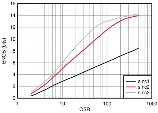 需要提及在选择一个较低抽取因子时所做的折衷,这一点很重要:较低的抽取因子(也被称为“过采样比 [OSR]”)降低了滤波器输出的分辨率。图 3 示出了针对某一给定的 OSR 以及 TMS320F28377D 中各种可用滤波器类型的系统分辨率(用“有效位数 [ENOB]”来表达)。