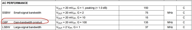GBP is the product of the amplifier's gain and its bandwidth (at that gain). So for small signal, GBP of an amplifier typically remains constant especially at higher gains. So as the gain increases the bandwidth should proportionately decreases. But for lower gain because of the gain peaking, this might not hold true (see figure 6-1 of the datasheet). So for lower gain say G=1, you should, look of SSBW (small signal bandwidth) for finding the device bandwidth. Where as LSBW (Large signal Bandwidth) should be looked upon for the the bandwidth when the input is a large signal.