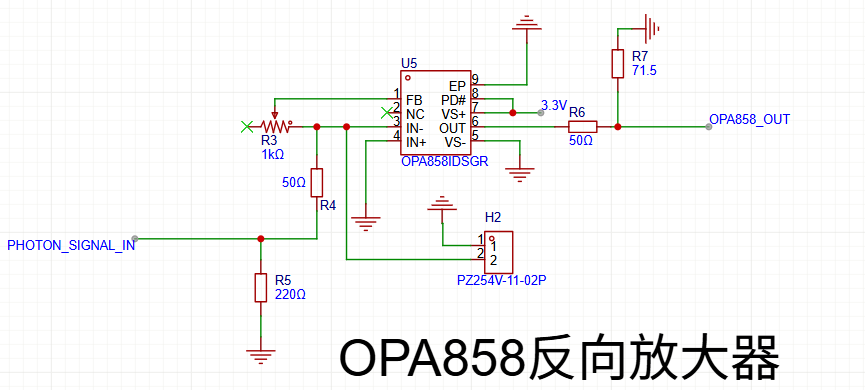 我用OPA858制作了一个反相放大器,原理图如图所示: