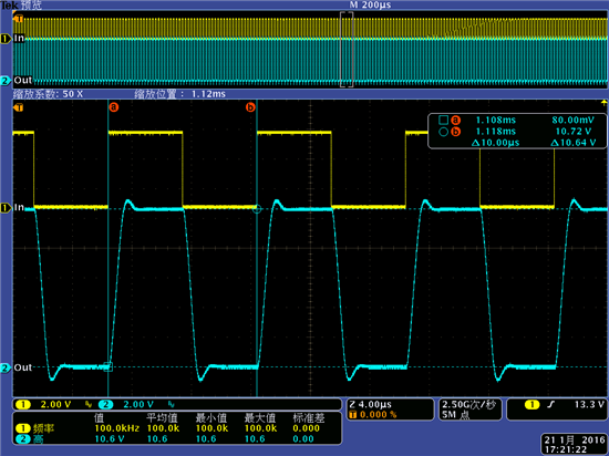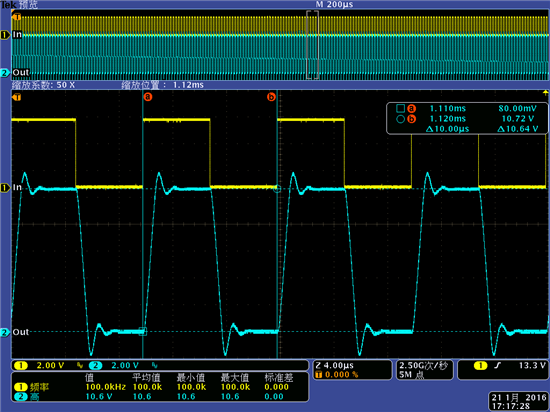 去掉R5电阻,对应的输入输出波形,输出波形尖峰较大