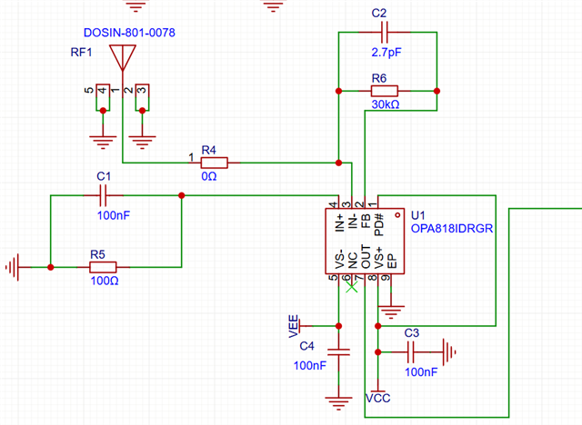 我无法确定PD这个引脚是否需要连接Vs+,在OPA818集成产品中,并没有连接该引脚: