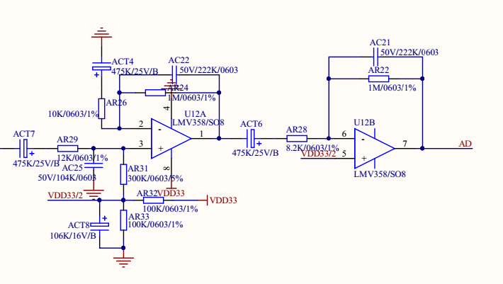 从电路的结构来看,是一个交流放大器。反馈端使用了一个电容ACT4,那么这个放大器的直流增益是1,LMV358的输出是轨到轨的,但是输入却不是,会比电源电压低1V多的样子。所以这样的放大器结构限制输出幅度的不是输出摆幅,而是输入共模电压。