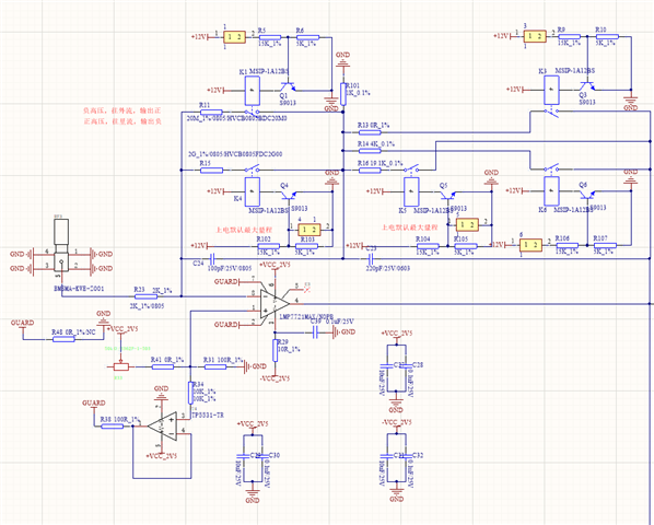 我用LMP7721搭建了TIA电路测试电离室的微弱电流信号,使用T型网络设置了若干组电阻以及继电器配置,以达到量程切换的目的,但是调试时却有一个大问题,即电路在0输入或者输入悬空时,电路输出有大偏压,也可以说饱和到电源轨了,在同相端加偏置根本无效。我怀疑是继电器线圈电压对开合电路的电阻漏电流造成的,所以绕过继电器,不焊,但是电路还是有偏压,偏压会小一点。使用信号发生器串接500M电阻模拟电流信号,当输出几百pA时,TIA输出的偏压开始被抵消,这时候在同相端加偏置也能调了,且输入输出基本符合增益设置,目前看增益没问题,但是偏压是个大问题,这个偏压到底是哪来的呢?真的是漏电流吗?能有这么大吗?但是我不焊继电器,不接继电器的电源都有偏压,偏压还会漂(室内空调很凉爽,芯片温度也不高),这个偏压到底是哪来的呢?怎么消除偏压呢?希望TI的工程师帮忙看一下这个问题,非常感谢!