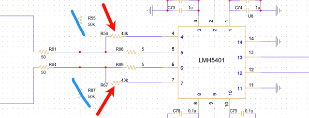 如下图所示,R56和R67电阻为43KΩ,这样有什么影响?