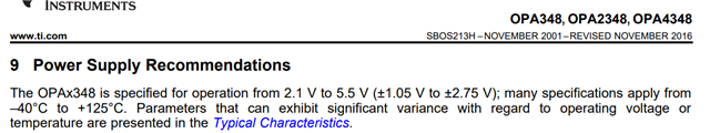 OPA2348的供电问题:OPA2348的规格书中描述这款芯片的供电是单电源供电,在网页的产品详情中的参数描述中是\Total supply voltage (+5 V = 5, ±5 V = 10) (max) (V)5.5Total supply voltage (+5 V = 5, ±5 V = 10) (min) ,我现在有个设计,用的是这款芯片,供电是+3.3V,和-3V,产品工作也很正常,我想咨询一下这款运放是否支持正负3V供电?