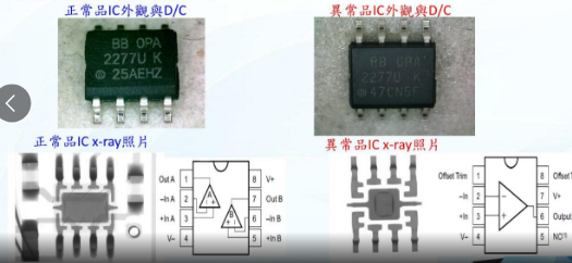 We have received two separate lots of the OPA2277U (SOIC-8, orderable device OPA2277U/2K5) and performed X-ray inspection on both. The images reveal a noticeable difference in the appearance of the silicon die inside the packages.