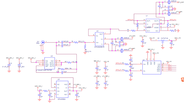 您能描述一下“低频脉动干扰“吗? 有什么好处? 趋势? 脉冲宽度? 连续还是间歇? 示波器照片? 输入是否开路? 短路? 是否连接到传感器? 您是否在运算放大器的输出引脚上看到了脉冲、或者在信号链中看到的距离更远? OPA392 中没有任何内容应该产生任何低频重复脉冲。 它使用传统的 N 和 P 轨到轨输入级(无斩波器或电荷泵)。 脉冲是否与系统中的任何其他活动同时发生? 当时电源上是否有任何瞬态? 我会考虑 24V 电源...因为如果输入未连接、会导致电流源击穿、所以有任何噪声。 输入级的阻抗相当高 (~100k)。 输入布线是否经过屏蔽或暴露? 分压电阻器 R5 和 R6 是否在输入端附近? 还是靠近放大器? 输入连接器和放大器之间的总布线长度是多少? C4 和 C9 采用什么类型的 10uF 电容器? 陶瓷电容器可以是微音器电容器、如果振动、承受应力或受到影响、则其作用类似于梯形麦克风。 我猜是输入端的电容式或电感式拾取器。 降低阻抗会使拾取衰减。 手波可能是一个线索、好像您已接地、可能会无意中屏蔽噪声或将噪声传导至电路中。 尝试以下操作:获取示波器和裸示波器探头、示波器设置为最低灵敏度 (~2-5mV/Div)、时基设置为您设置的任何值以查看脉冲、将示波器探头在电路上方 1cm 处波形以查看是否可以检测脉冲以及脉冲可能来自何处。 此外、环顾周围的环境、看看是否存在任何外部噪声发生器。