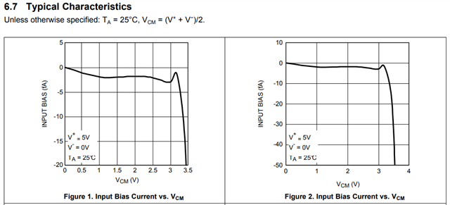 Having said that, within 2V of positive rail (Vcm>3V on 5V supply) IB increases due to limitations of the bootstrapped circuitry keeping voltage across ESD diodes close to zero - as reverse-bias voltage across ESD diode increases, this results in the increase of leakage current, thus higher IB (see sudden IB roll-off above 3V input common-mode voltage).