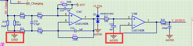 很多时候,当前分流电阻的GND端会有所不同,因为如果GND节点与"AGND"节点之间存在电压差,这将形成共模电压差,而差分放大器(第一级放大器的配置)会抑制该差分电压。因此,只要"GND"与"AGND"之间的电压差不过高,这不应成为问题。
