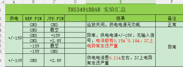 然后THS3095和THE3091也是只差异2个PIN,我将THS3491焊接在THS3091上,将PIN1、PIN8分别手动跳线焊接,无论处于哪种方式,上电空载,无输入信号,VCC的供电(+/-15V)电流都有0.15A,芯片会异常发烫;
