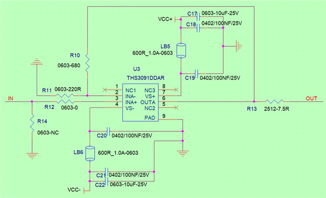 2、如下是实验结果和 THS3091的原理图。PIN1和PIN8收到跳线更改,见实验结果的表格; 【备注:我更换了2颗THS3491一样会发烫】