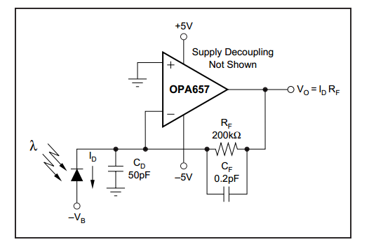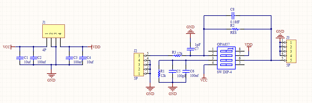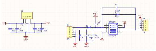 近期用opa657芯片做跨阻放大器,电路图是按芯片手册(即第一张图搭的),用的光电二极管是BPW34,但是用示波器测输出的是直流信号。而论坛上有人输出的是交流信号,不懂是电路问题(原理图为图二),还是我理解上的问题,求指教