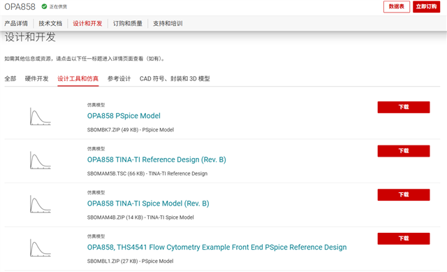我们的 Spice/Tina-TI 模型位于我们器件的产品文件夹下,位于“设计与开发”-->“设计工具与仿真”选项卡下。例如,OPA858 仿真模型位于此www.ti.com.cn/.../OPA858。您可以试试这里面的模型。