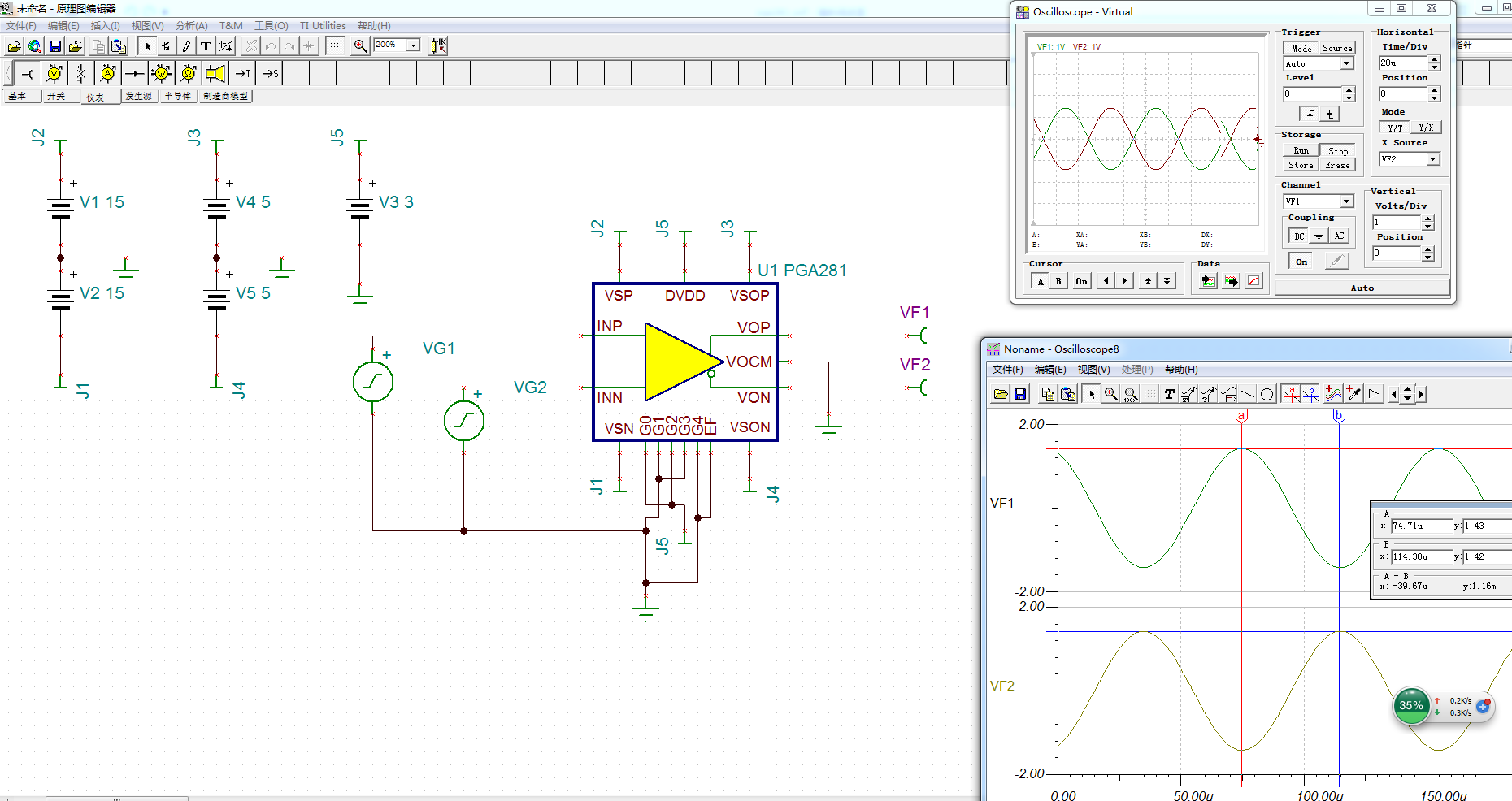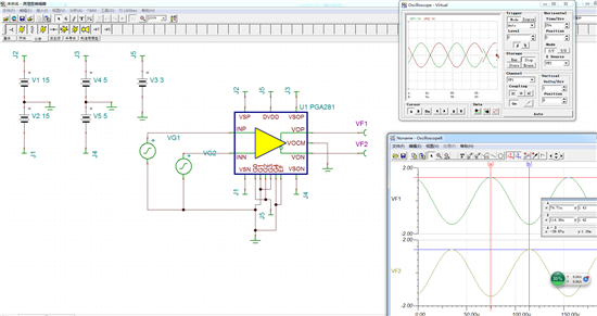 1、首先我采用VSP=15V,VSN=-15V。VSOP=5V,VSON=-5V。DVDD=3V供电,VOCM=0V。但是输出总是低于我实际的放大倍数。如下图: