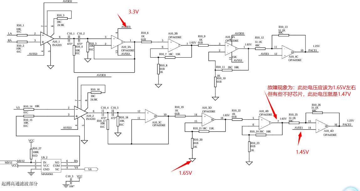 只要更换A10_3(OPA4336E)芯片故障点的电压就能正常输出1.65V. 请问可能是哪些问题故障,