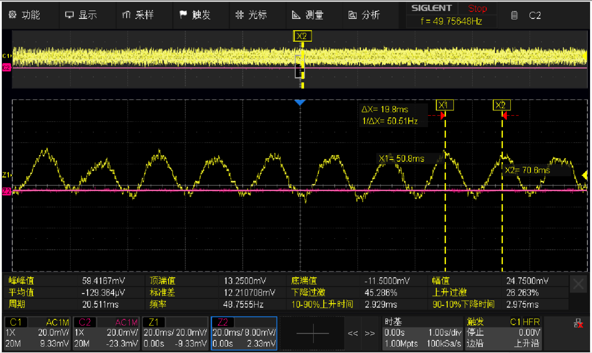 2.当 R9 不焊接,通过 R6,R10 分压到1.25V给到 TIA 偏置,通过 R7,R8,R12分压到1.06V,给到电化学传感器恒电位电路偏置(由于该偏压传感器手册规定的偏压值为0.19V),此时通电后, TIA 输出会先稳定几秒,然后就会出现一个 50Hz 的正弦波叠加。