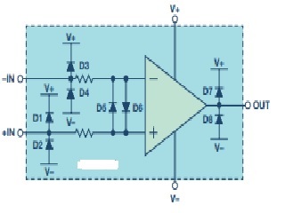 3.我们看到其他的运放内部具有一些钳位二极管、TVS二级管保护,不知到OPA452也采用了这种结构么,就是外部需不需要再加这种保护,如图:
