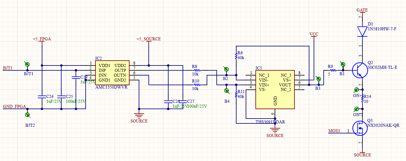 通过DAC输出直流电压至AMC1350,AMC1350为隔离放大器,将信号固定缩小为输入的0.4倍,再将信号通过THS3091搭建的运放电路将信号放大为原来的4倍去驱动BJT的基级,现在AMC1350输出信号是正确的,但是经过THS3091输出的信号一直不正确,THS3091根据输入信号的不同,每次放大倍数处于10到30倍的范围的某个值,我通过拆下R9,将THS3091后级电路断开,仍然会出现这种情况,原理图入上图所示,请问是电路设计还是哪里存在问题,另外THS3091能否驱动BJT也就是三极管,谢谢!