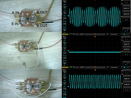 OPA2695是双运放,从A IN接入信号源,但是没有输出信号,B OUT接示波器,下图是我测试的三种情况下的波形