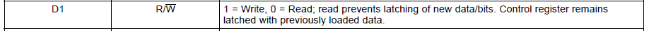 1.这个40位控制字中,D1所代表的读写到底是1代表写入呢还是0代表写入呢(write是高电平有效还是低电平有效)?Datasheet中前后描述不一致,如图: