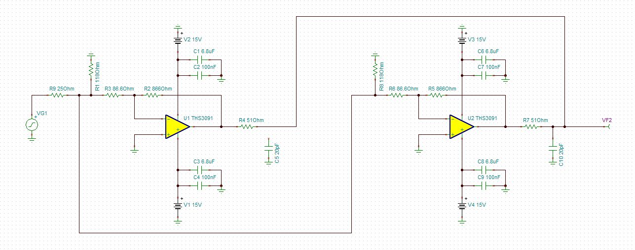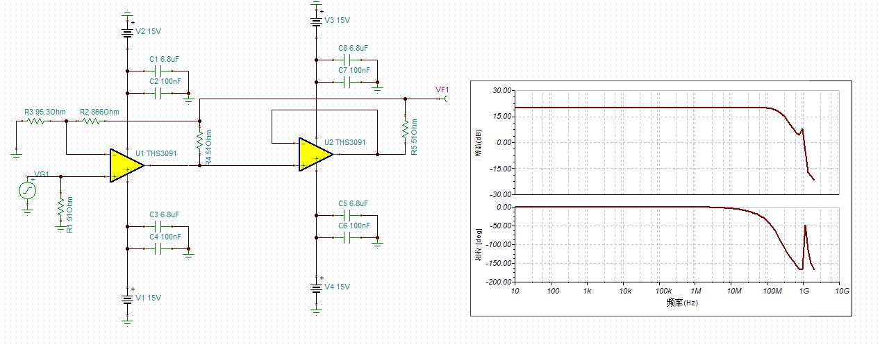 建议使用THS6012,附件里是TINA文件。建议先估计一下负载端的输入/寄生电容,并添加到TINA模型的输出端。如果这个电容较大,则加大R1和R2的阻值,但是保持两者比值不变。虽然6012是双通道的,放在你的应用里只能用一个通道,但是价钱便宜,官网报价一颗才3.7$。你现在评估的3091,一个就要3.35$,一个应用里用两个,要6.7$。显然还是6012便宜一些。