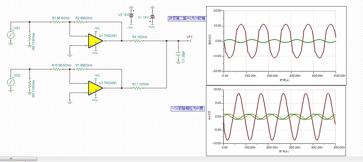 因为不允许两个输入端,所以我用如下电路仿真。把第二路的Rg改为30欧姆,结果并联得到的依然不是正弦波,有没有其他办法,使得并联输出效果改善呢?