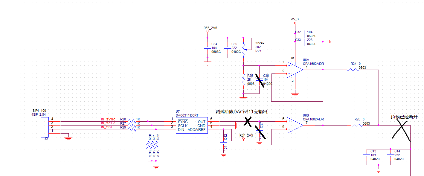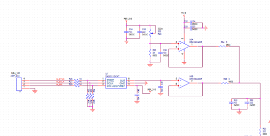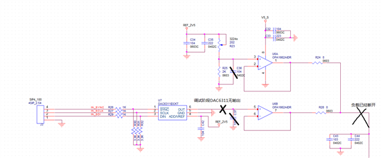 4、之前的电路,将两个跟随器隔开(opa2365的两路),断开如下图中的R24,R28,测试发现跟随器效果很好,无发热并且轨到轨输出。
