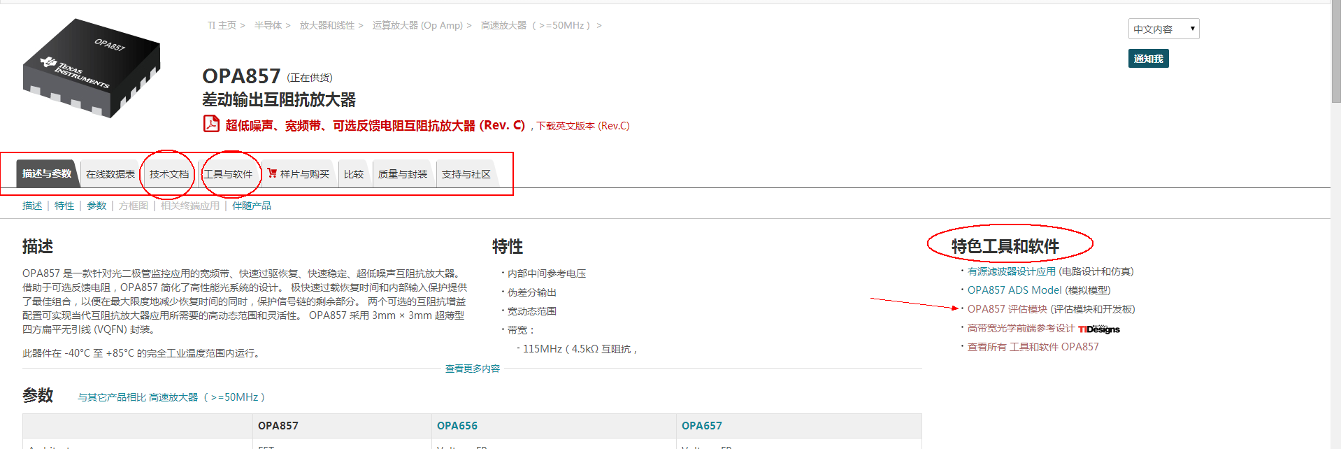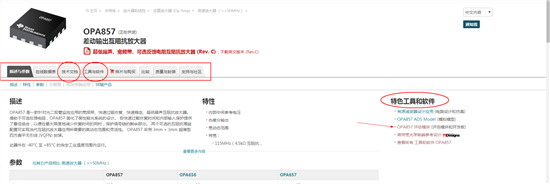 TI官方资料相对来讲还是比较齐全的,搜索芯片进入TI官网页面时,会看到描述与参数,在线数据表,工具与软件等很多项目。如下图: