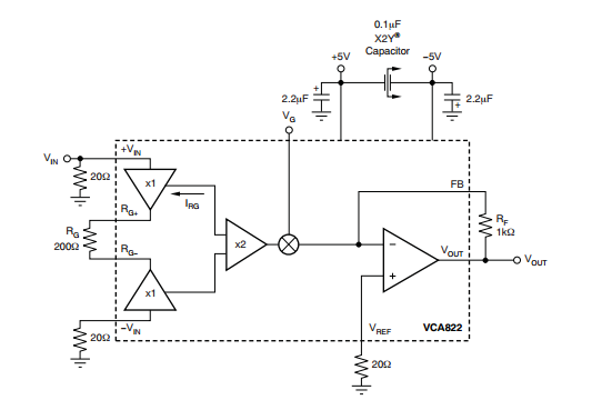 按严格按照DATA SHEET搭建完电路,VG接一电阻接地,RF=1K,RG=200 按照DATA SHEET的figure4,意思就是VG=0,放大倍数大概5倍。