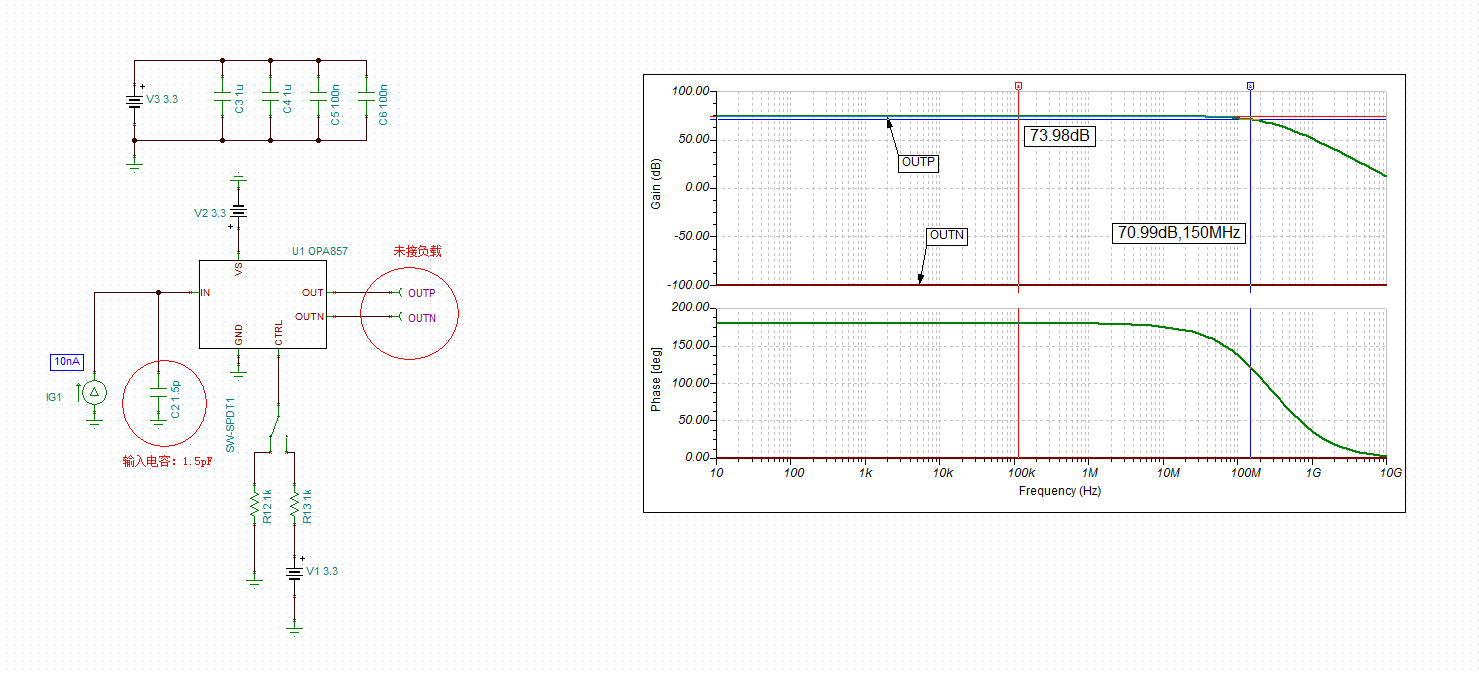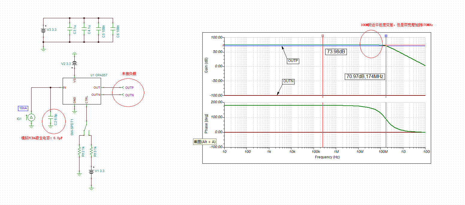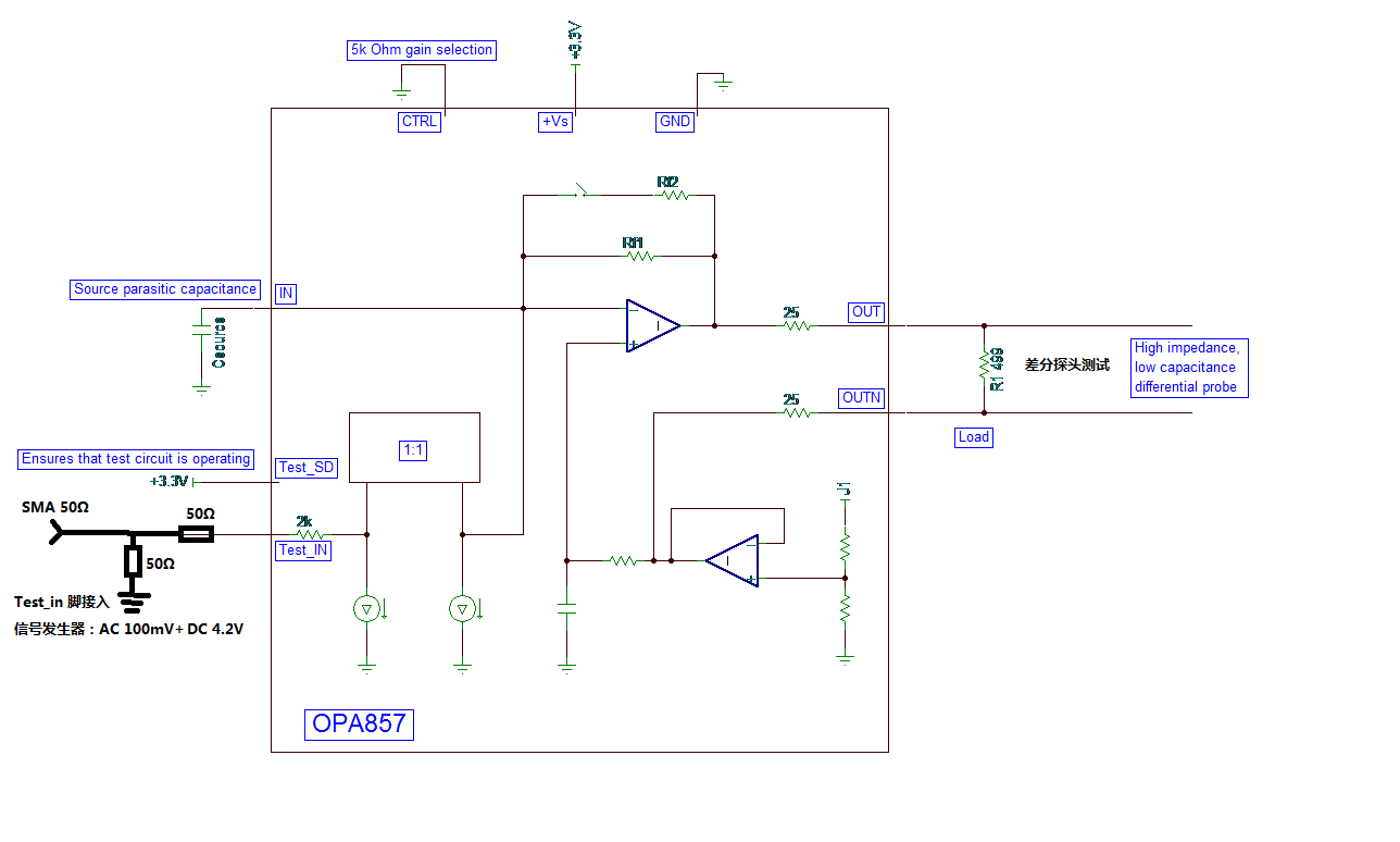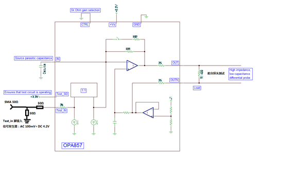 1、使用TIA跨阻放大器OPA857作为APD管电流转换电压的第一级电路。用857的Test模式,在其Test_in脚输入AC信号+DC偏置,测试发现其带宽也就12M左右,数据手册上说明无论选择哪一个增益,带宽都在100M以上。
