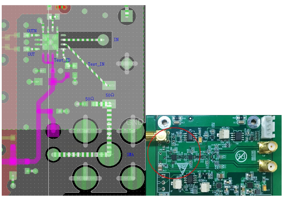 4、连接方式:信号源通过SMA屏蔽线连接到Test_in脚,输出端直接用差分探头测试,如下图中所示。