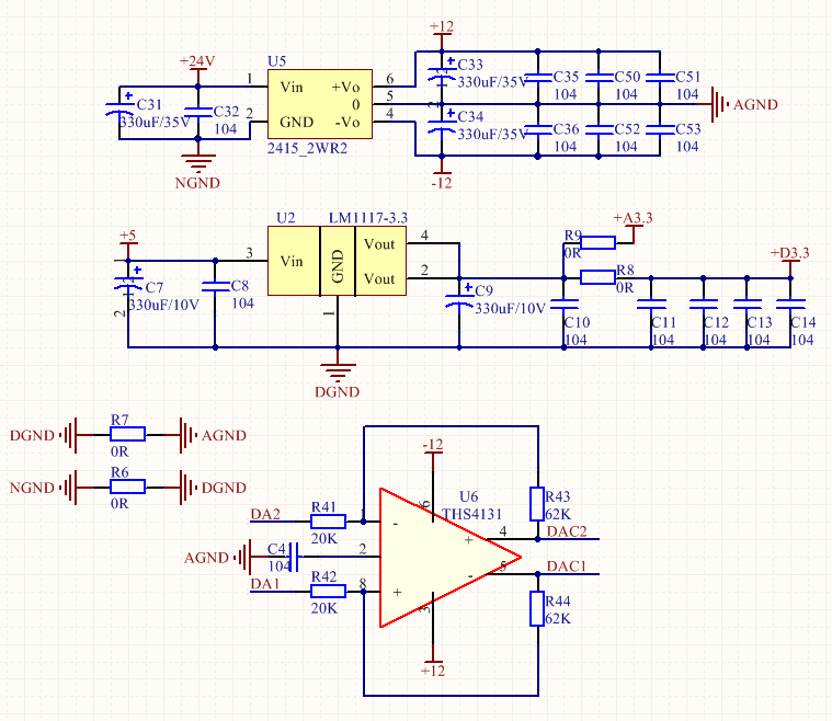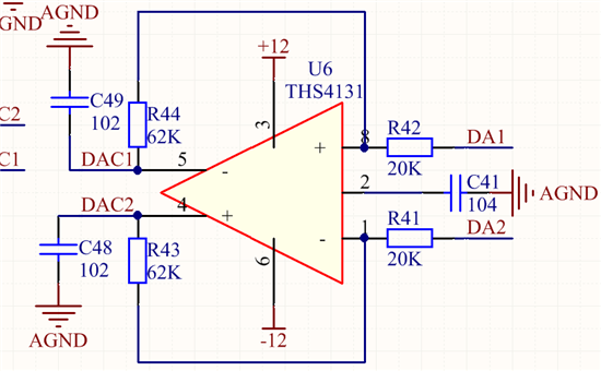 我想把两路DA产生的两个信号经这个差分放大器放大。IC:THS4131