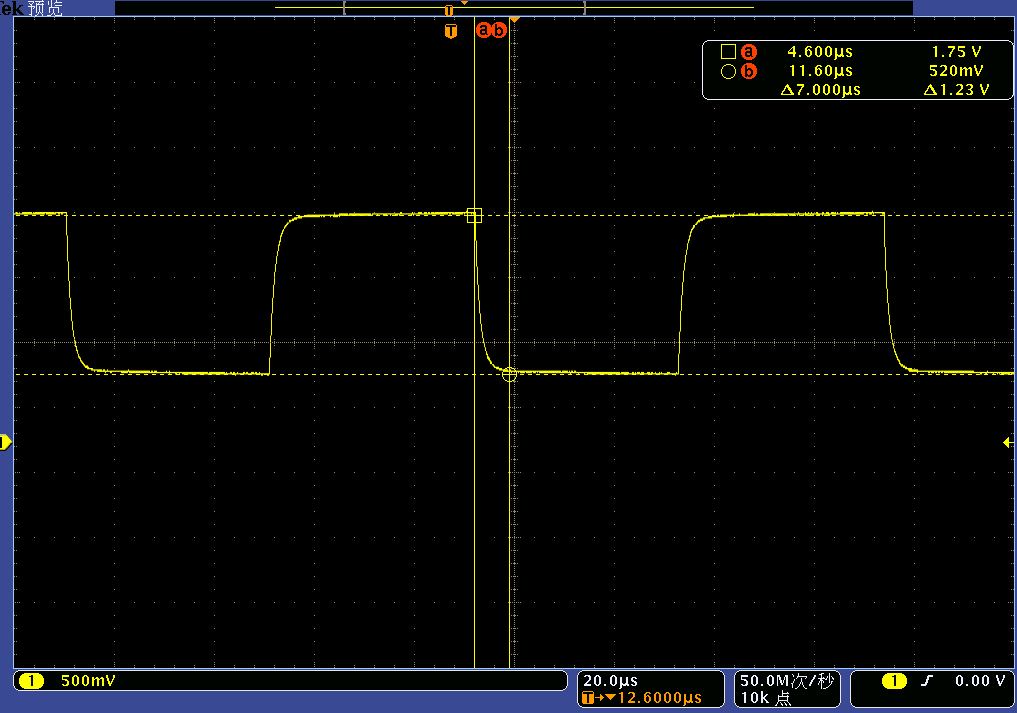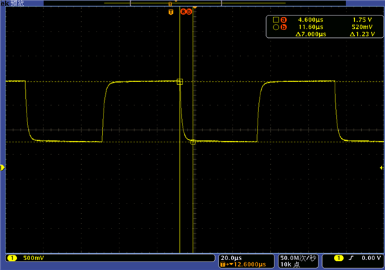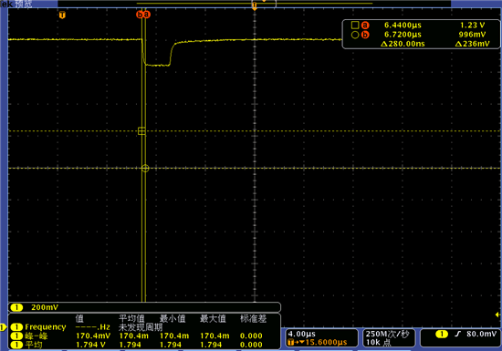 第二次,同样电路板,第二次焊接的。测试完全不满足要求,上升时间都5us以上了。PS:第二次测试,如果光发射脉冲任然是2us脉宽,检测端完全不能进入稳定状态,波形是三角波样子,所以加宽了脉宽,看看上升时间到底是多少。(两次波形输出,都是OPA857的OUT端输出)