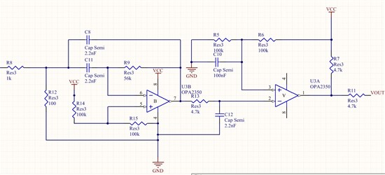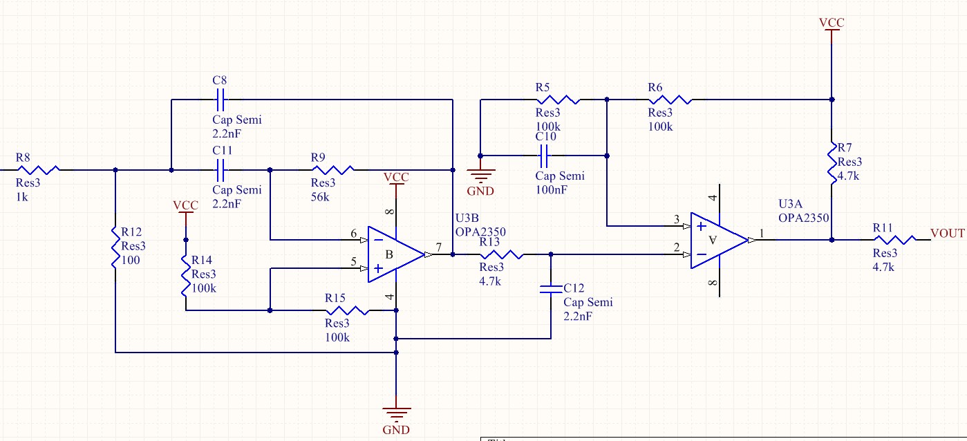 OPA2350做的带通滤波器,为何输出端输出的波形中低电平有1.4v左右这么高?这不像轨到轨的特点吧。电源是3.3v的,请各位专家帮帮忙,产品近期就要发货,急死了!
