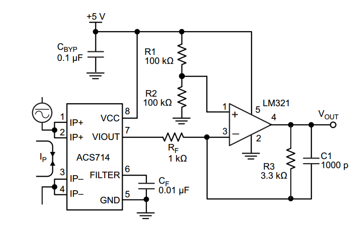 我看电路的放大倍数还是1。如果把电路改成:ACS714的输出加在运放得“+”端,“-”端与输出短接,用做缓冲、跟随,不是更好!