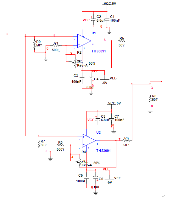 两个THS3091并在一起驱动50欧姆的负载,示波器显示有电压,负载两端却没有电压,后来在THS3091前接了个BUF634缓冲器然后驱动5欧姆的电阻有微弱的电流变化0.05A左右,示波器电压显示12V。