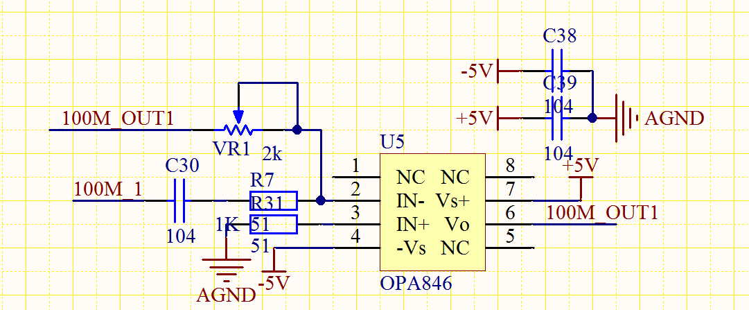 用OPA846放大 将VPP800mv 100Mhz的信号,放大到1.4V,麻烦各位专家帮我看看下面这个电路图有没有需要改进的地方