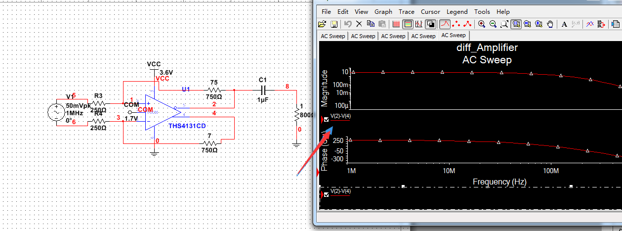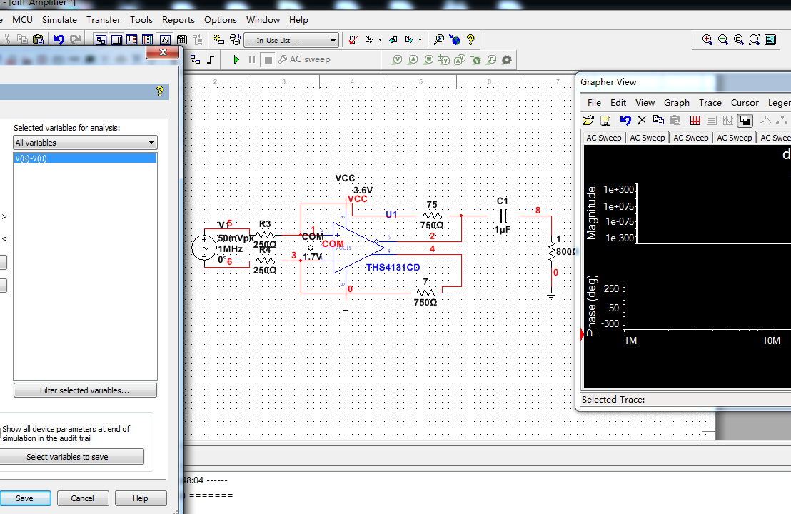 我用全差动THS4131时,将输出端当做单端用,仿真无结果。。。以下是我的仿真及仿真结果图。
