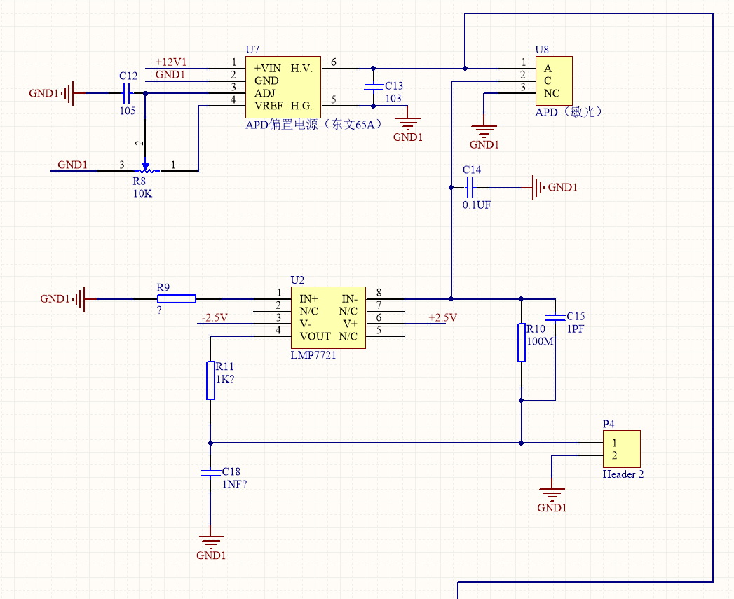 我进行了如图的微电流放大设计,IN-直接进APD的微电流,100M为取样电阻,R9和R11目前用0的电阻短接,C18未接,R10目前用的是10M的电阻(是不是太小,APD电流在几十nA到几百nA之间)为什么我一打开光源,LMP7721的输出就变成它的正供电电压,接近2.5V,而我测量8脚到地的电压却可以根据光源的强弱变化,也有零点几伏,很奇怪,,,