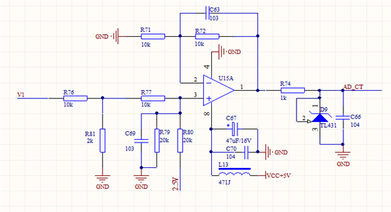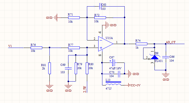 是的,R80和R79分压提供一个1.25V参考电压,因为U15A是单电源供电,这样输入端一个参考电压保证V1输入满足U15A的输入共模电压范围。