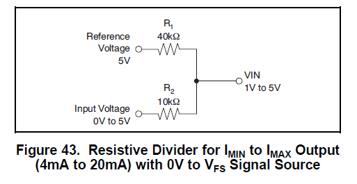 假设输出4mA,Rset=2.5Kohm,根据公式可计算输入电压为1V,但如果是0V的话,在输入端可加一个分压电路,XTR115内部集成regulator输出5V,只要在输入端建立一个电阻分压电路即可。datasheet 中Figure 43给出了例子: