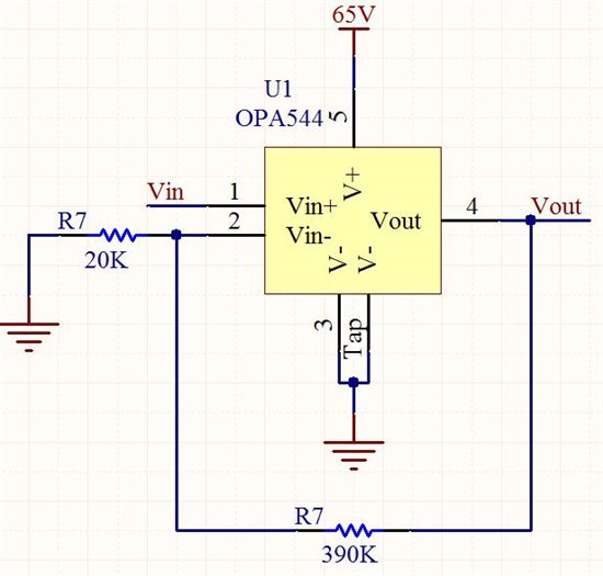这是我的OPA544简单的测试电路图,供电65V后,无论我的 Vin 怎么变化(0V~3V之间),输出都是64V左右,请问是怎么回事呢?谢谢~
