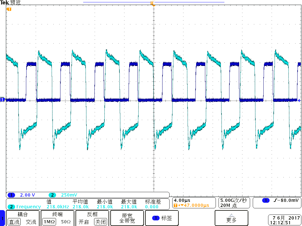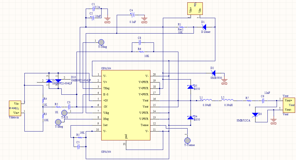 用OPA564作为功率放大器,输入数字信号为218KHz的方波,峰峰值5V,现检测+IN,-IN两端电压差100mV,供电电压双向+5V,-5V;增益为10;频率218Khz,负载8欧姆,但是输出电压波形失真,且输出电流远小于上限1.5A,电路图如下,波形图中深蓝色为电流检测管脚Iflag相较于V-端的电压,浅蓝色为输出电压,请问一下失真原因与Iflag大于2V 的可能原因。谢谢~~