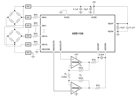 我在使用两个ADS1158设计压力采集电路时,使用ADS1158手册中5V单电源、OP365组成RAIL TO RAIL放大电路的参考设计。 当我把放大倍数提高到1000倍时,输入直流差分电压 1.70V和1.67V(差分电压30MV),放大电路输出电压端出现大概周期400ns的振荡信号。甚至影响到输入端直流信号也出现锯齿波。请问是什么原因?