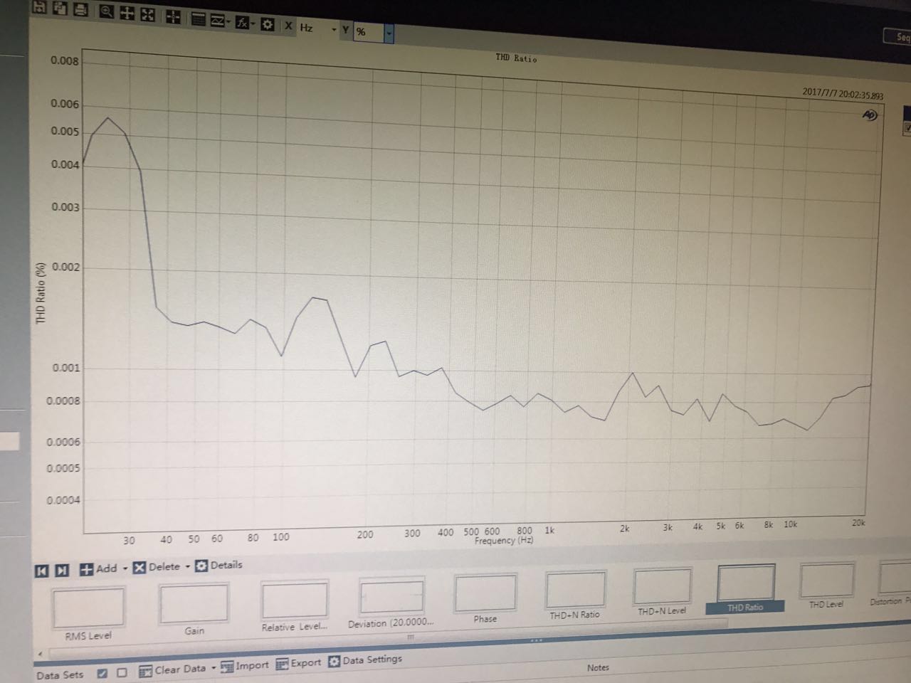 用的是官方电路图,放大倍数是4倍,供电电源是正负32V,用AP测的THD的指标如下图所示: 现在问题是在20-40HZ THD偏大,请教一下各位NI论坛的大侠这块有没有办法解决呢? 我有看过其他人设计的这块电路,没拿到电路,也只有一个指标图,他的20-40HZ指标就做的不错。基本上是比较平坦的,不会像我现在这样有个凸起。 但是参考datasheet上面的THD+N的曲线在低频有个凸起。