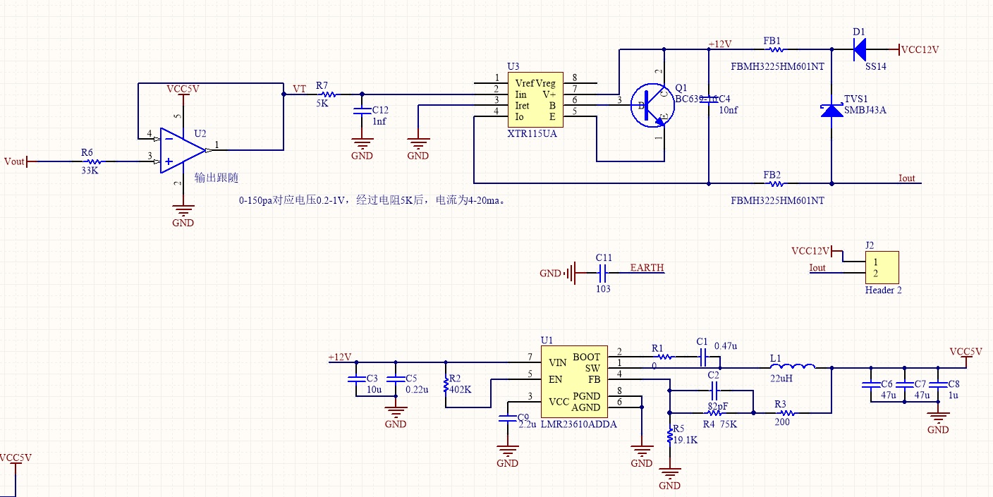 如图,这个电路为12V直流供电。VCC5V是电源芯片输出的5V给传感器供电。Iout接个负载电阻RL到12VDC的负端。