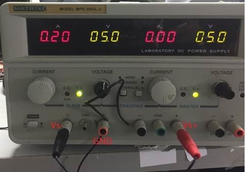 最近在用THS3120D EVM,加单电源供电(10V)没有问题,但是加上双电源供电(正负5V),出现负电源部分200mA的大电流,按照规格书上推荐设置REF和PD脚电压都为0,应该是进入了POWER-DOWN模式,理论上静态电流只有200uA,不会有200多mA的大电流,不知道是我供电有问题还是设置REF和PD脚有问题,求用过这个模块的大神解答,谢谢!!! 电源接法和芯片设置如下