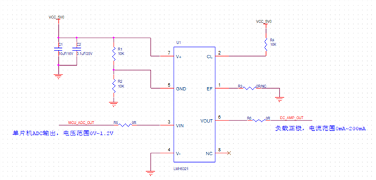 后端负载需要单片机的DAC输出电压范围0V~1.2V,按前端需求输出对应的电压值,DAC输出电流比较弱,需要放大到最大300mA,后端负载功率最大的情况是1.2V ,300mA