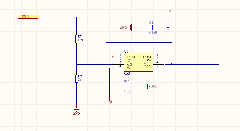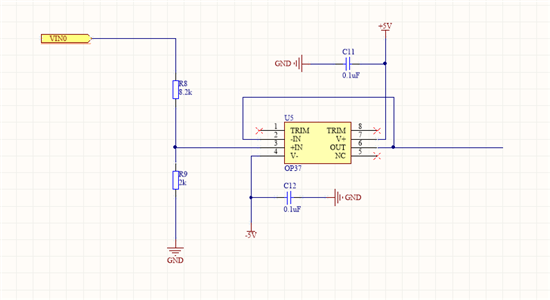 考虑到带宽问题故选用了OP37,对分压衰减为输入信号1/5的信号进行跟随稳定